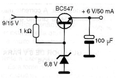Con el micro regulador de tensión ilustrado en la figura podemos elaborar una fuente de alimentación para pequeñas radios, calculadoras, relojes y otros aparatos cuyo consumo no sea mayor de 50 mA. La entrada se puede hacer con tensiones de 9 a 15 V. El diodo zener es de 400 mW y el capacitor electrolítico tiene una tensión de trabajo de 6 V o más.