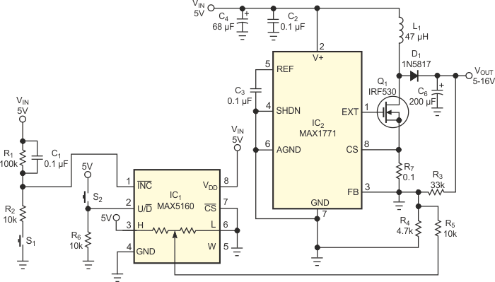Usando componentes Maxim, este circuito consta de un regulador para un convertidor elevador. El circuito opera en el rango de tensión indicado. El MAX5160M consta de un potenciómetro digital.