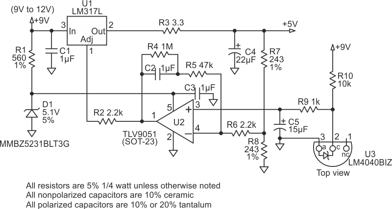 Al utilizar el LM317 (o LM350), este circuito se basa en componentes reguladores de precisión como los de Texas Instruments, de los que se obtuvo el circuito. La configuración que se muestra es específicamente para 5 V, pero se puede cambiar para otras tensiones.