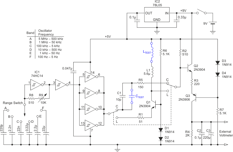 Con el circuito que se muestra es posible medir capacitancias e inductancias usando un multímetro ordinario. Los componentes son comunes y el ajuste debe realizarse en base a componentes de valores conocidos.