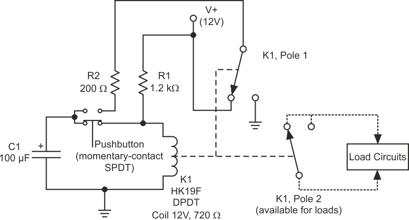 Este circuito aprovecha la histéresis de un relé para proporcionar un efecto de enclavamiento. El circuito actúa como un disparador y los componentes deben estar de acuerdo con el relé utilizado.