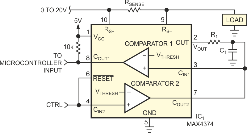Este circuito se basó en el MAX4374 de Maxim. El circuito detecta la corriente en una línea de 0 a 20 V y tiene una señal de salida temporizada, con tiempo dado por R1 y C1. La alimentación se suministra con 5V.
