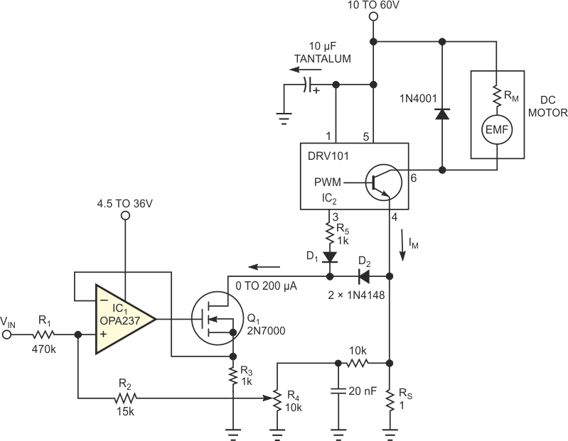 Basado en un funcionamiento OPA237 y DRV101 de Texas Instruments, este circuito permite el control de un motor usando señales PWM sin la necesidad de retroalimentación. La corriente depende del integrado utilizado. Ver hoja de datos.