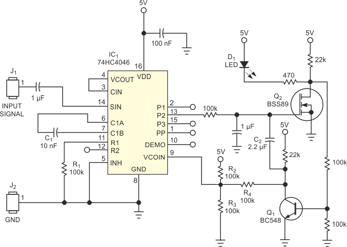 Basado en la lógica NXP 74HC, este circuito se puede adaptar para varios usos. El circuito también se puede utilizar con alimentación de 12 V y el circuito se puede reemplazar con un PLL 4046 común.