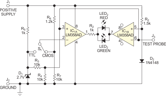Usando el LM358 de Texas Instruments, este circuito usa indicadores LED y puede ser alimentado con tensiones de 5V o según la lógica analizada.