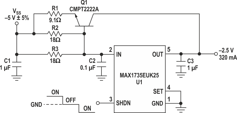 El propósito de este circuito es aumentar la corriente de un regulador MAX1735 para obtener una salida que alcance los 320 mA. El circuito se basa en una documentación de Maxim.