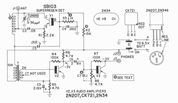 Indicado como receptor de la banda policial, este circuito fue encontrado en documentación de 1960. En ese momento, esta banda era utilizada por la policía. Los transistores están hechos de germanio y el teléfono debe ser de alta impedancia.