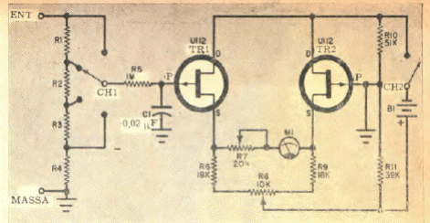 Este circuito se encontró en una Popular Electronics desde agosto de 1967. Los FET son del período, pero se pueden usar equivalentes de propósito general. El instrumento es de 100 uA.