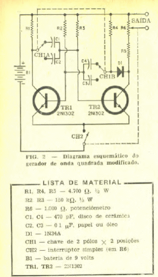 Este multivibrador astable se obtuvo de una Popular Electronics de agosto de 1967. Los transistores son tipos de germanio de ese momento y las frecuencias se seleccionan en dos rangos mediante capacitores de conmutación.