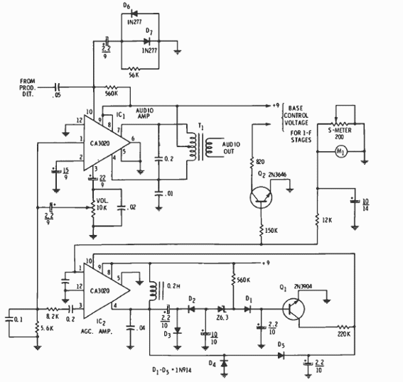Encontramos este circuito en un Radio Handbook de 1977. Los componentes utilizados son de la época. El circuito consta de un amplificador de audio con control automático de ganancia.