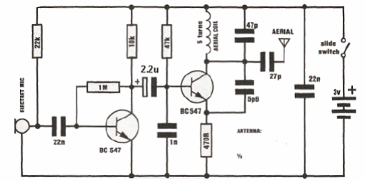 Este conocido circuito es otra versión de un transmisor de 2 transistores que se encuentra en Internet. En este circuito, la sintonización se realiza cambiando la bobina.