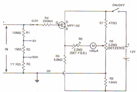 Este circuito simple se puede utilizar con un microamperímetro ordinario o con el rango de corriente más bajo de un multímetro. La resistencia de entrada es de 11,1 M ohms.