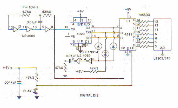 Este circuito se basa en un display de cátodo común de 7 segmentos. El circuito está basado en tecnología CMOS y puede alimentarse con tensiones de 6 a 9 V.