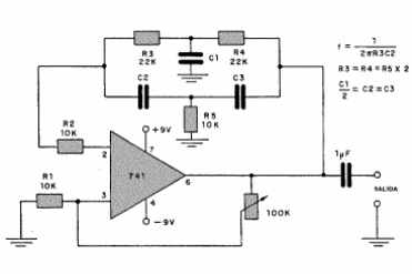 En la figura tenemos la configuración típica de un oscilador de audio sinusoidal con doble T. La frecuencia viene dada por la doble T y se puede calcular mediante las fórmulas al lado del diagrama.