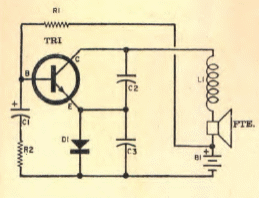 El propósito de este circuito es imitar el goteo de un grifo. El circuito se encontró en una Popular Electronics desde marzo/abril de 1969. El transistor admite un equivalente.