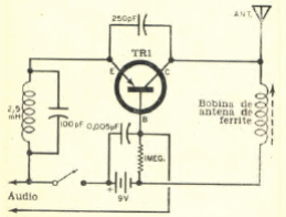 El rango de transmisión de este transmisor puede oscilar entre ondas medias y cortas dependiendo de las bobinas. El circuito es de una documentación de 1969. El transistor es germanio de la época.