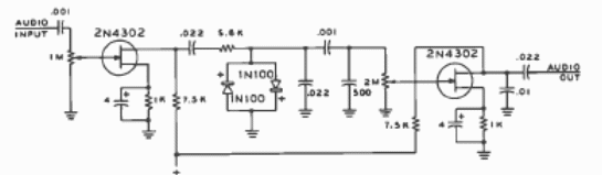 Encontramos este circuito en un manual de circuitos americano de 1977. Los componentes son de la época. Su propósito es limitar la señal cortando los picos que causan la sobremodulación.