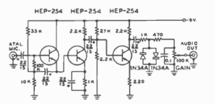 Este circuito limitador para micrófonos de cristal se encontró en la documentación de 1977. Los transistores eran tipos de propósito general en ese momento.