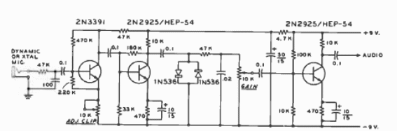 Este circuito es adecuado para modular transmisores AM. El circuito es de una documentación de radioaficionados de 1977. Los transistores son tipos comunes en ese momento.