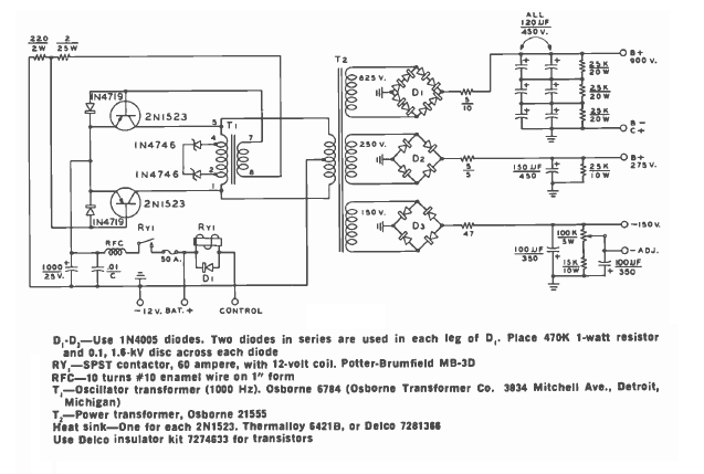Encontrado en una documentación para radioaficionados de 1977, este circuito está destinado a alimentar equipos de 12 V de la batería del automóvil. Los transistores son tipos de potencia de la época.