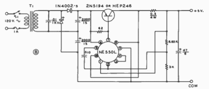 Encontrada en una documentación de 1977, esta fuente de alimentación utiliza un circuito regulador integrado de la época. El transistor está de acuerdo con la corriente de salida.