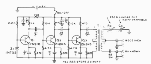 Este circuito combina varios generadores de ruido blanco para probar equipos de transmisión. El circuito es de una documentación de 1977.