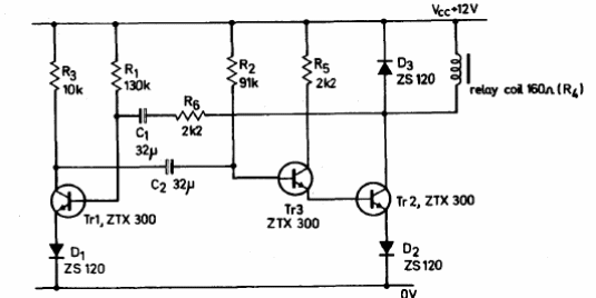 Encontrado en un manual de transistores Ferranti de 1974, este circuito impulsa un relé sensible de 12 V en ciclos asimétricos dados por los capacitores. Los capacitores se pueden cambiar.