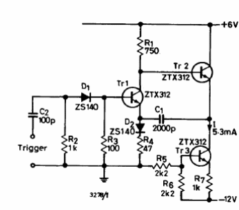 Encontramos este circuito en el manual de transistores Ferranti de 1974. Los transistores son de propósito general y la sincronización viene dada por C1.