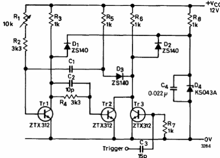 Encontrado en el manual de transistores de 1974 de Ferranrti, este circuito usa transistores de propósito general de la época. Los tiempos de pulso se pueden ajustar en un rango de 4 a 1.