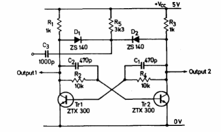 Este circuito es de un manual de transistores Ferranti de 1974. Los transistores son tipos de propósito general en ese momento. La tasa de conmutación máxima es de 100 kHz.