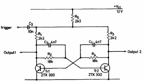 Este circuito, para biestables lentos, se encontró en el manual de transistores de Ferranti de 1974. Los transistores son de propósito general y la frecuencia máxima de funcionamiento alcanza los 50 kHz.