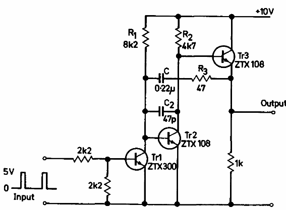 Este circuito usa un integrador de retroalimentación. Lo encontramos en el manual de transistores de Ferranti de 1974. Los transistores son tipos de propósito general en ese momento.
