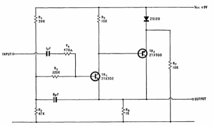 Este amplificador con dos transistores y ganancia unitaria se encontró en un manual de transistores Ferranti de 1974. Los transistores son tipos comunes en ese momento.