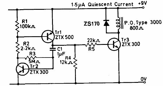 Encontramos este circuito en el manual de transistores de Ferranti de 1974. Los componentes son de la época. Tenga en cuenta el tipo de relé utilizado.
