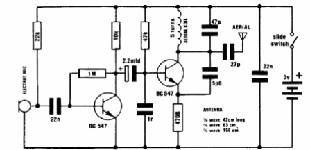 Ensamblado con componentes SMD, este circuito puede ser muy pequeño. El alcance es de unas pocas decenas de metros. Encontramos una documentación australiana de 1991.