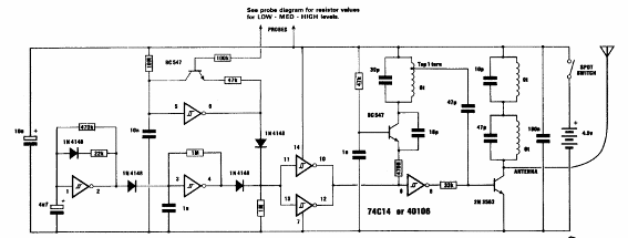 Este circuito fue encontrado en una publicación australiana de 1991. Es un transmisor que transmite una señal cuando detecta humedad. El rango es del orden de unas pocas decenas de metros.