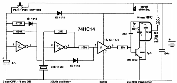 Encontrado en una publicación australiana de 1991, este circuito tiene un alcance de 15 metros cuando se alimenta con 5 V. La bobina se puede fabricar en la propia placa de circuito impreso.