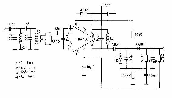 Este circuito se obtuvo del Manual de Circuitos Integrados de Siemens de 1976. Es el circuito para aplicar el TBA400 como amplificador de banda ancha.