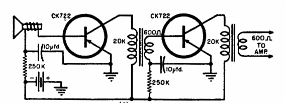 Al igual que los circuitos anteriores, este utiliza un pequeño altavoz como micrófono y tiene dos pasos de amplificación con una salida de 600 ohms.