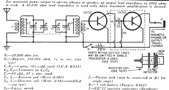 Este receptor de AM se encontró en un manual de circuito Raytheon de la década de 1960. Los transistores son los primeros tipos comerciales disponibles. La salida se realiza a través de auriculares.