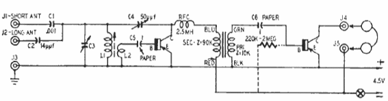 Este receptor utiliza uno de los primeros tipos de transistores disponibles en el mercado, el CK722, pero se puede implementar con otros. El circuito es de un manual de Raytheon de la década de 1960.