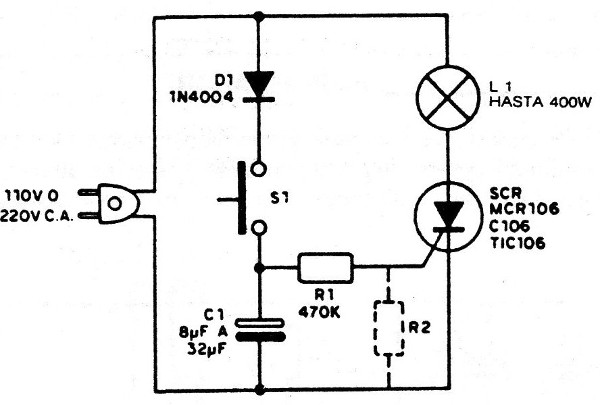 La lámpara L1 (incandescente) permanece permanecerá encendida por un intervalo de tiempo fijado por R1 y C1. El capacitor C1 debe tener una tensión de trabajo de 250 V o más para la red de 110 V, y de 350 V o más para la red de 220 V. R2 será necesario en el caso de los SCRs del tipo TIC106; su valor está entre 1 k y 22 k. EI SCR debe ser dotado de disipador de calor si L1 fuera de más de 40 W.