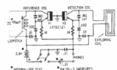 Este buscador de metales de dos transistores se encontró en un manual de Raytheon de la década de 1950. Los transistores son de germanio de la época.