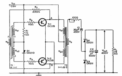 Este inversor de tensión se encontró en un manual Mullard de 1960. Los transistores son de esa época. No se da información sobre transformadores. La corriente de salida máxima es del orden de 250 mA.