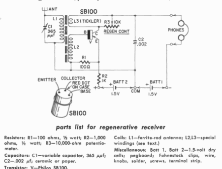 Indicado para la gama de onda media, este receptor fue encontrado en una publicación de Gernsback de 1960. El transistor es de germanio de la época y los auriculares son de alta impedancia.