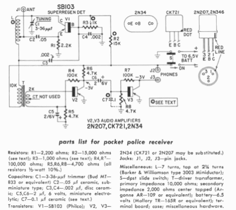 Este receptor para la banda policial, que en ese momento era de 45 MHz, se encontró en una publicación de Gernabck de 1960. Los transistores son tipos de germanio de la época.