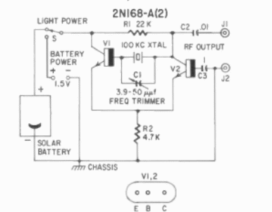 Este circuito alimentado por celdas solares genera una señal estándar de 100 kHz. El circuito es de una documentación de Gernsback de 1960.