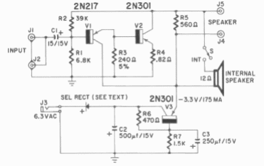 Encontrado en una publicación de Gernsback de 1960, este circuito hace uso de transistores de germanio de la época. La potencia es del orden de una fracción de watt a pesar de utilizar un transistor de mayor capacidad.