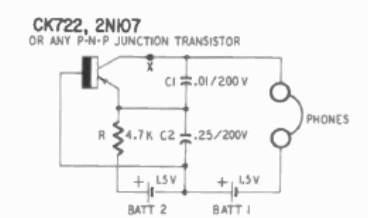 Este circuito aparece en otra parte de este sitio utilizando los transistores más diversos. Esta versión es de una documentación de 1960 que utiliza los transistores de germanio 2N107 o CK722 de la época.
