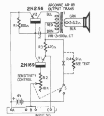 Adecuado para uso general y alarmas, este circuito oscilador Hartley de una documentación de Gernsback de los años 60 utiliza transistores de germanio. El transformador es un de salida de audio con un conector central.